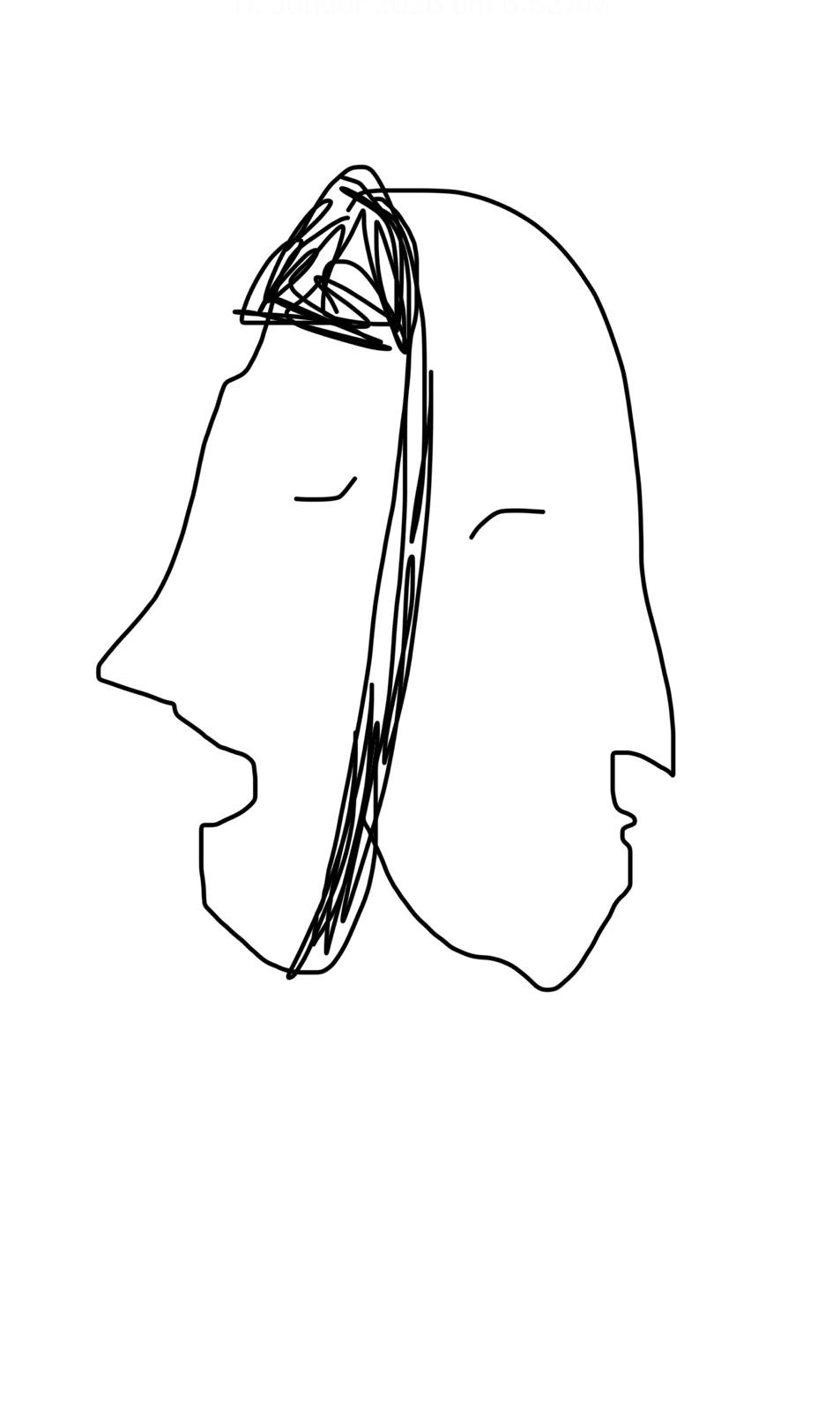 Zwei Gesichter teilen sich eine gemeinsame Kontur und blicken in entgegengesetzte Richtungen, als wären sie zwei Seiten derselben Person. Die linke Silhouette wirkt offen, mit geöffnetem Mund, fast wie im Sprechen begriffen, während die rechte ruhig, verschlossen und in sich gekehrt erscheint. Zwischen ihnen verläuft ein dichter, dunkler Strichvorhang, der wie ein gedanklicher Riss oder ein Schleier wirkt, durch den die beiden Hälften voneinander getrennt sind und doch untrennbar verbunden bleiben.